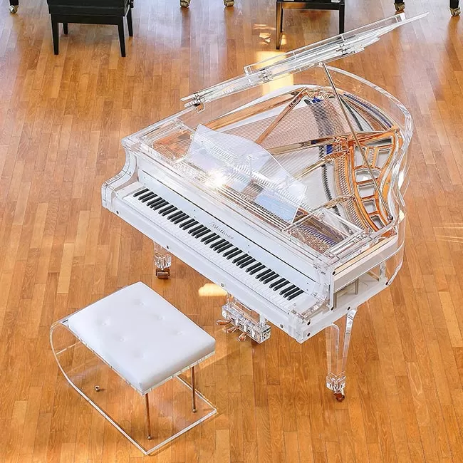 Un piano de cola completamente transparente que parece estar flotando es la culminación de más de 170 años de fabricación e innovación por parte de Blüthner Pianoforte Fabrik. Hasta ahora, quienes afirmaban haber producido un piano de cola totalmente transparente y completamente personalizado seguían sustituyendo las voluminosas vigas de soporte de madera por vigas de acrílico, mientras utilizaban innumerables tornillos antiestéticos.